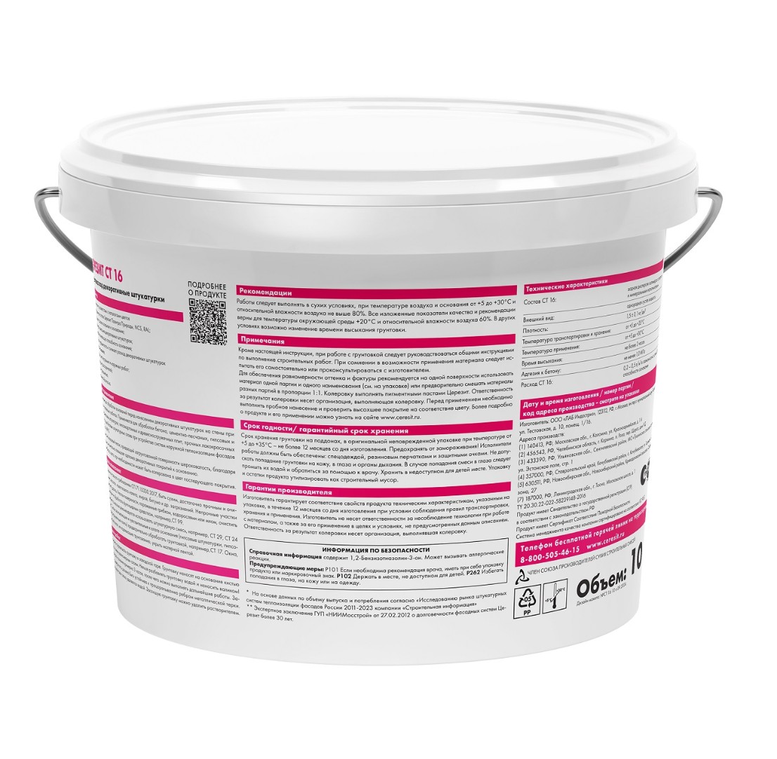 Назначение грунтующего состава CT 16 – подготовка поверхностей к нанесению декоративных штукатурок. Используется в помещениях и при обработке фасадов. Эта грунтовка подходит практически для всех видов оснований – от гипсокартона и бетона до древесностружечных панелей и цементно-песчаных штукатурных смесей. Она гарантирует отличный результат на прочных лакокрасочных покрытиях, гипсовых поверхностях и цементно-известковых основах. Также ее применяют в качестве базовой защиты фасадов в наружных теплоизоляционных системах Ceresit VWS и WM.