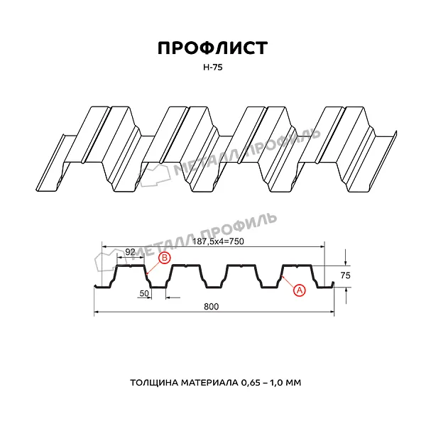 Профлист МЕТАЛЛ ПРОФИЛЬ Н-75x750-A (ОЦ-01-БЦ-0,7) — популярный материал для оформления профилированного листа. Представляет собой стальной оцинкованный лист с покрытием. Общая толщина стальной основы с цинковым и декоративно-защитным покрытием — 0.7 мм. Проходя процедуру холодного проката, сталь принимает волнообразный вид. Несущая способность такого листа на порядок выше плоского.